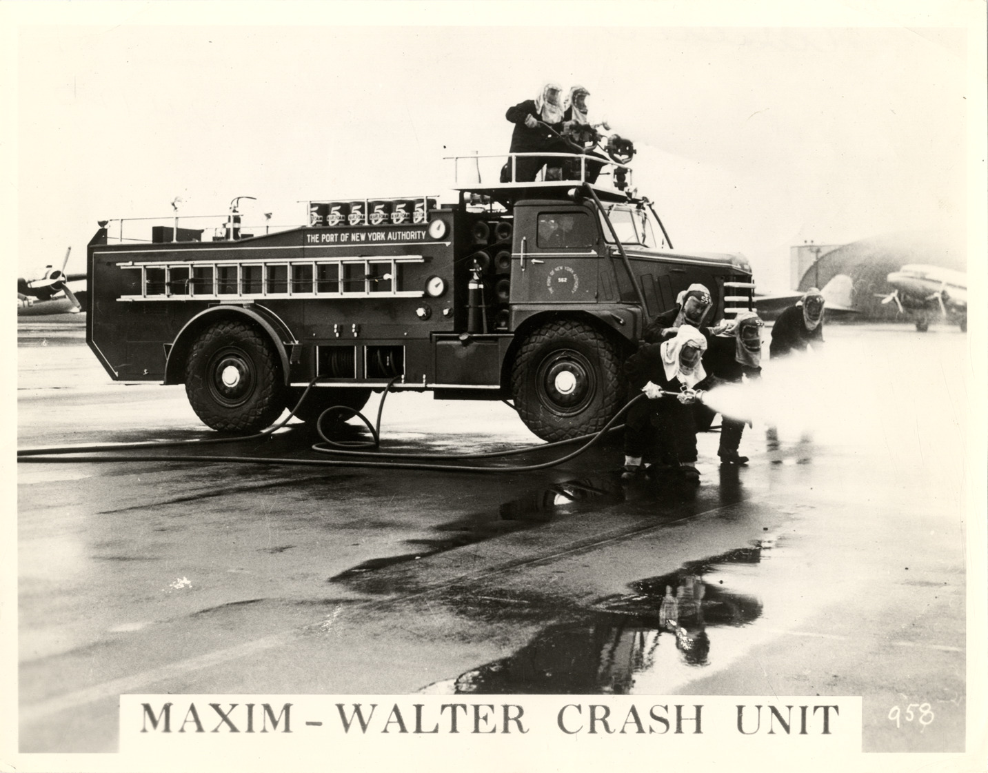 View of firemen with the Maxim-Walter Crash Unit at airport. "The Port of New York Authority" is painted on fire truck. Printed on front: "Maxim-Walter Crash Unit."