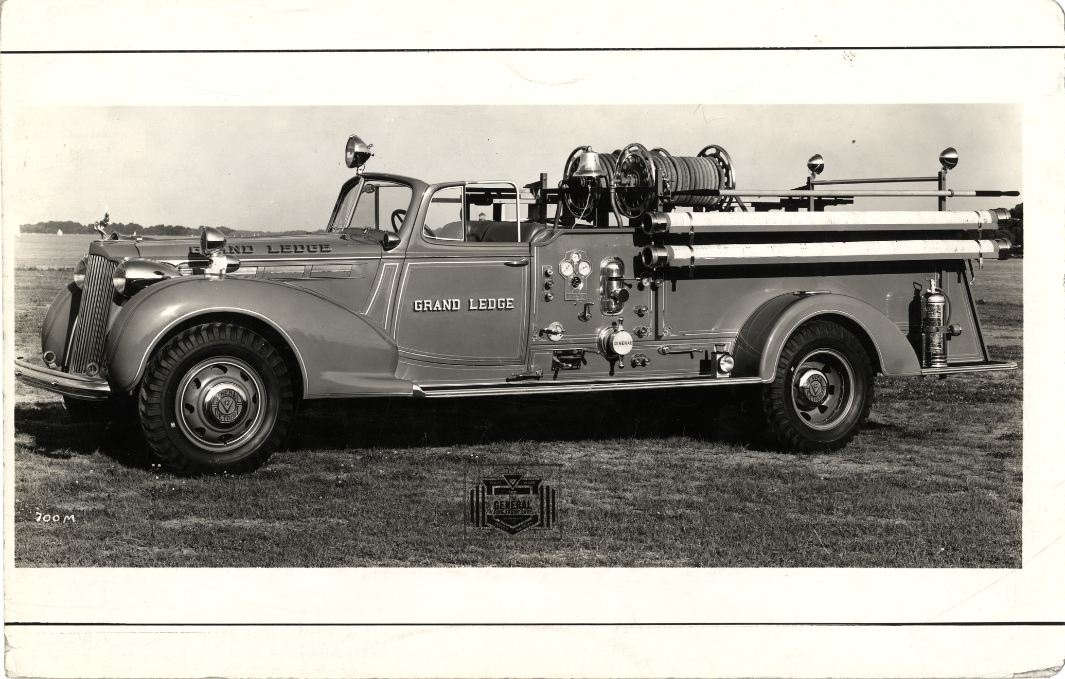 View of a 1938 General fire truck for the Grand Ledge Fire Department in Michigan. "Grand Ledge" is painted on truck. Printed on front: "The General Fire Truck Corp." Typed on back: "202 Grand Ledge, Michigan. 500 GPM, Custom, 1938." Stamped on back: "A photograph by MacGregor and Company, Detroit."