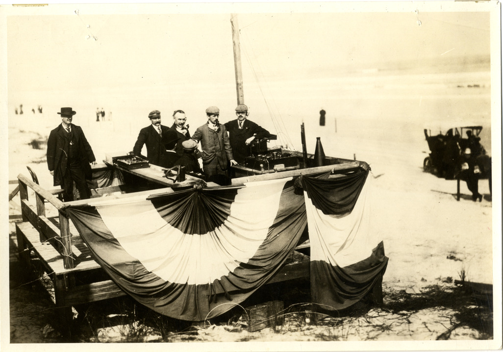 View of Walter C. Baker in stand with several men demonstrating his electric recording timing device at the Ormond-Daytona races. Stand is decorated with bunting. Label on back: "It was at the Daytona racing beach, in 1905, that Baker first demonstrated his electric recording timing device, eliminating the frequent arguments and contentions in close conclusions of a race."