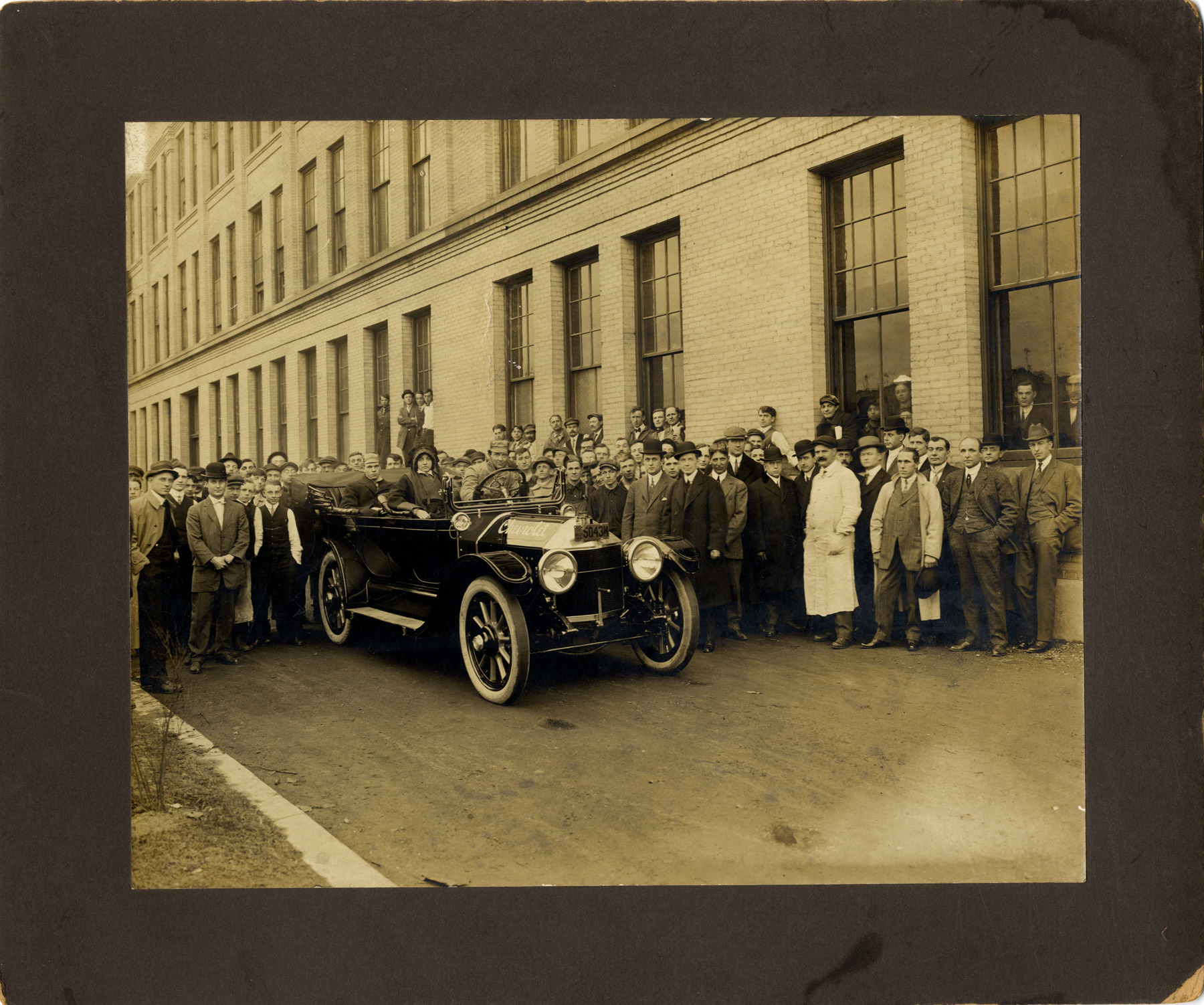 View of Russell Clifford Durant, the son of William C. Durant, and his wife posing in a 1912 Chevrolet Classic Six Series C automobile. Louis Chevrolet and William Durant are among onlookers in background. Stamped on back: "The Baker Art Studio, portrait and commercial photographers, 89 Park Place, Detroit, Mich." Printed on label: "Chevrolet, 1912. The first Chevrolet, a 6 cylinder model with a folding top and adjustable windshields. Louis Chevrolet in white duster and William Durant in black coat and derby on right. At the wheel is Durant's son with his wife beside him."
