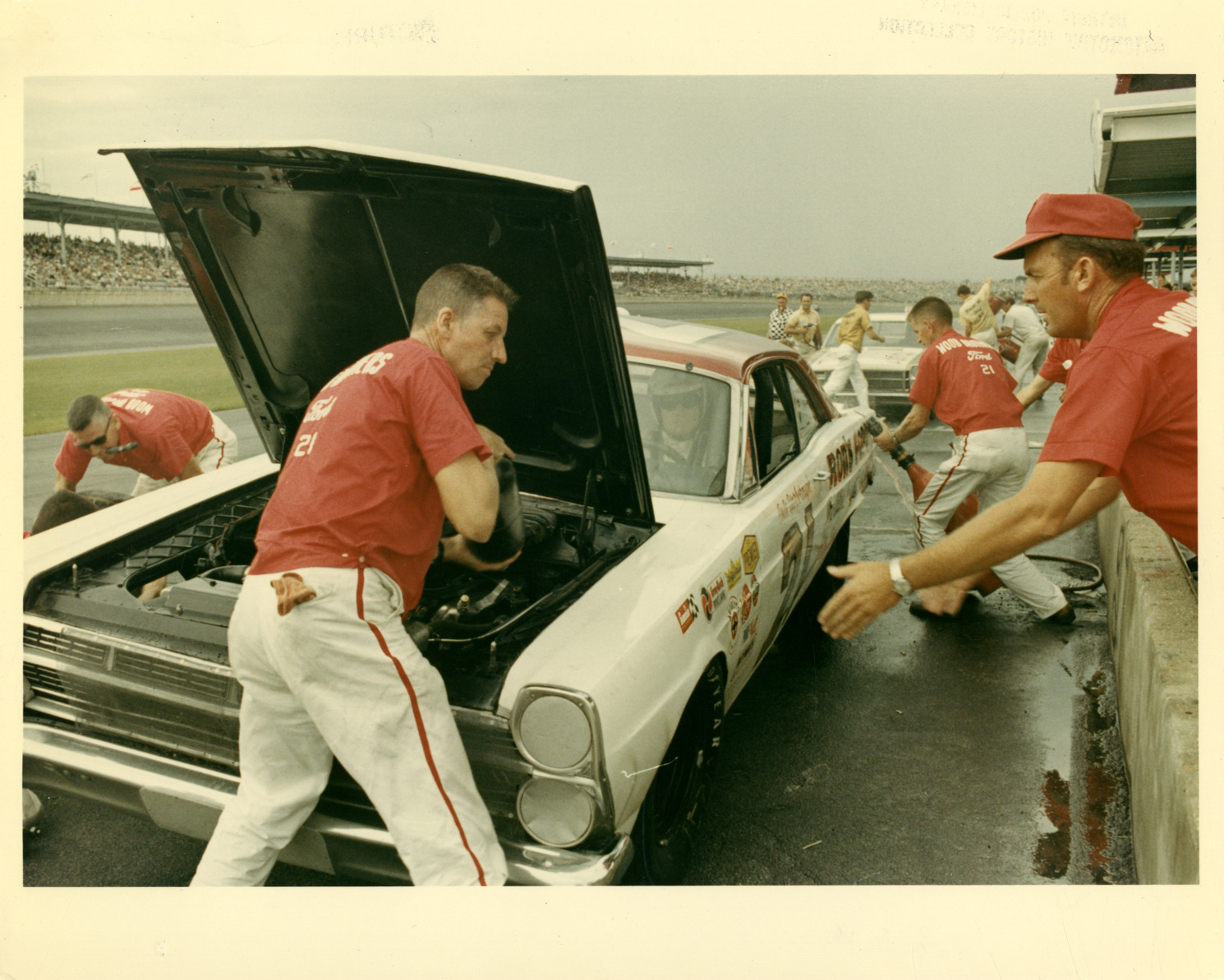 Favorite this☆ Pit crew with Ford stock car at racetrack Description: View of a pit crew working on a Ford stock car at racetrack. Crowds in grandstands in background. Details Resource ID: na041163 Subject: Stock cars (Automobiles) Pit crews Automobiles, Racing Stock car racing Ford Motor Company Photographic prints Date Issued: 1966 (year approximate) Format: 1 photographic print : col. ; 8 x 10 in. Member of: National Automotive History Collection Filing Location: Ford--Racing Rights: Physical rights are retained by DPL. Copyright is retained in accordance with U.S. copyright laws.