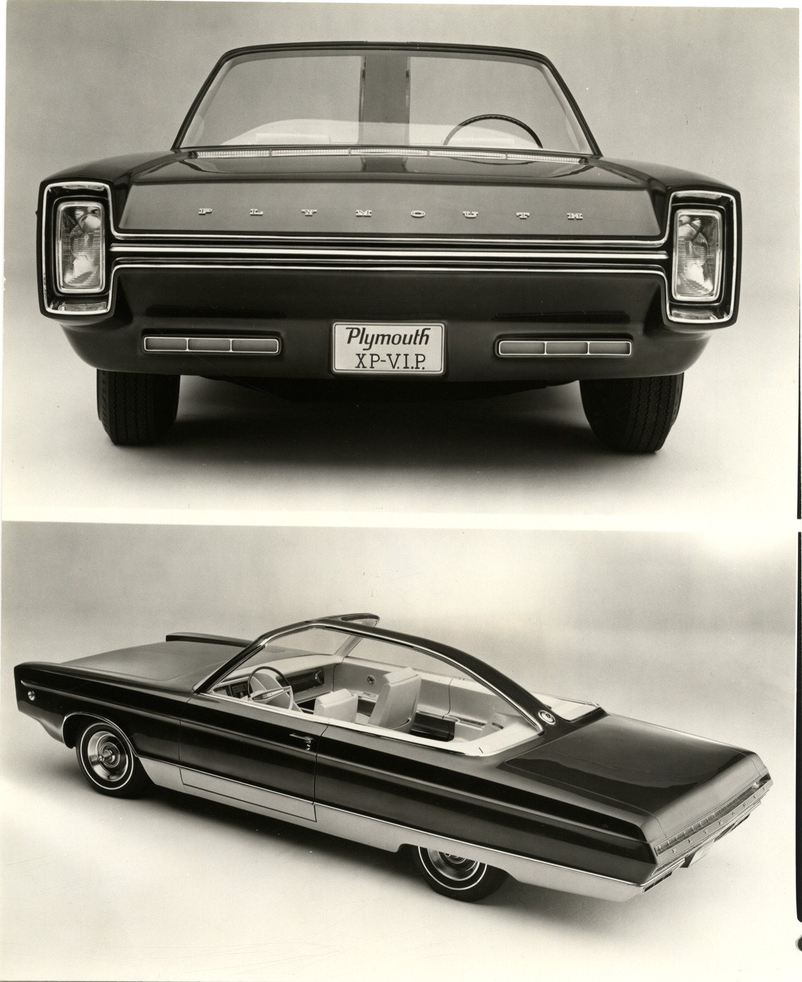 Two views of a 1965 Plymouth VIP coupe. Label on back: "For auto show sections. Plymouth XP-VIP, Plymouth's new idea car, which is designed to provide the ultimate in comfort, convenience, communication, entertainment and safety for freeway travel. The metal part of the top is a longitudinal roll bar, which acts as a guide for the upper portion of the flexible top glass. A striking new chameleon-type exterior paint in magenta features iridescent tonal changes from pink to brown to copper according to the way light strikes it. Power-operated head rests in front and reclining seats in the rear highlight the car interior. In the center console are a tape recorder, stereo and telephone, and on the instrument panel, a television set which can be viewed by all passengers, but is shrouded from the driver's eyes." Handwritten on back: "1965 Plymouth VIP show car."