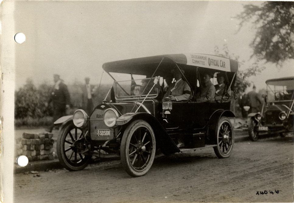 View of motorists posing in an Abbott-Detroit car. "Entertainment Committee Official Car" sign is displayed on automobile. Stamped on back: "Spooner & Wells, Inc., photographers, 1231 Woodward Ave., Detroit, Mich., telephone North 1745." Handwritten on back: "Northerners visit to Detroit, Sept. 7, 1911. Abbott-Detroit, ca. 1911."
