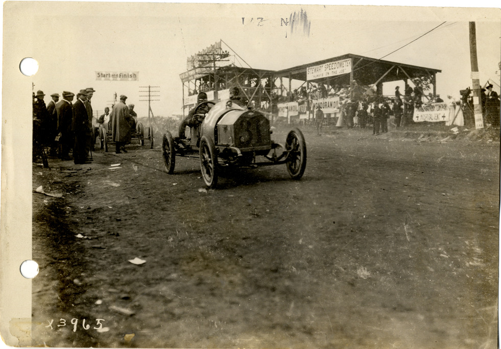 View of A.M. Robbins and passenger in 1911 Abbott-Detroit racecar no. 31. Grandstand, spectators and "Stewart speedometer, always on the job" banner in background. Stamped on back: "Spooner & Wells, Inc., photographers, telephones 3472-3473 Columbus, 1931 Broadway, New York." Handwritten on back: "Robbins in Abbott #31. Abbott '11."