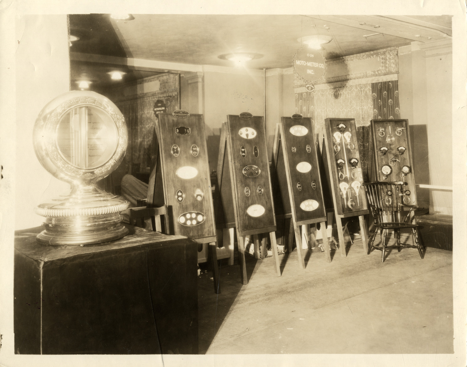 View of heat indicating meters and other equipment on display in the Moto-Meter Company exhibit at trade show. "Moto-Meter Co." sign displayed overhead. Handwritten on back: "Accessories, MotoMeter."