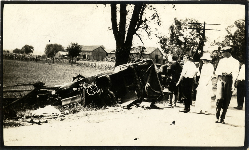 View of overturned car in aftermath of accident; onlookers stand in road. Typed on back: "Photographer: George Klein, Eastman Kodak executive and photographer. Accidents, ca. 1915."