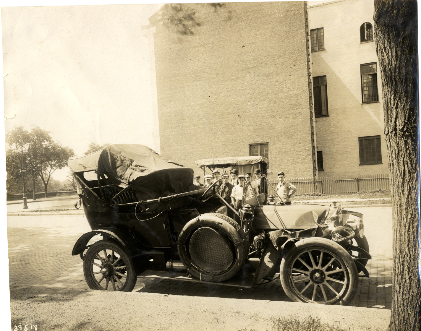 View of a damaged car on side of street in the aftermath of an accident. Group of onlookers stand in background. Stamped on back: "Spooner & Wells, Inc., photographers, telephones 3472-3473 Columbus, 1931 Broadway, New York." Handwritten on back: "Accidents, ca. 1912."