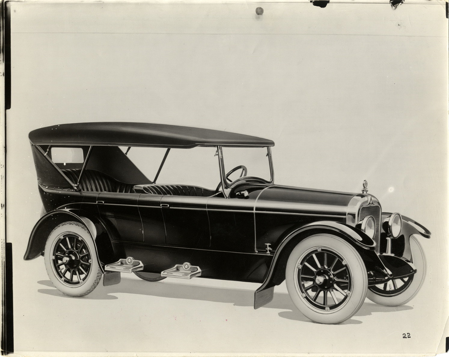 Artist's depiction of a 1921 Ace Six touring car. Label on back: "Ace Six, five passenger touring car, equipped with Guy disk valve motor." Handwritten on back: "1921."