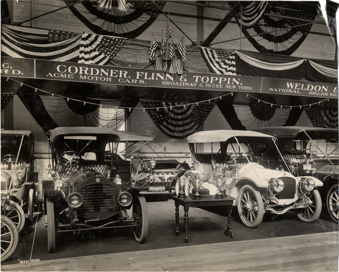 Favorite this☆ 1909 Acme automobiles on display in trade show Description: View of 1909 Acme cars on exhibit in a trade show. Table with trophy cups in foreground. "Cordner, Flinn & Toppin. Acme motor cars, Broadway & 76th St., New York" sign is displayed in background. Handwritten on back: "Acme, 1909." Details Resource ID: na041317 Subject: Automobiles Acme Motor Car Company Trade shows Photographic prints Date Issued: 1909 Format: 1 photographic print ; 7.5 x 9.25 in. Member of: National Automotive History Collection Lazarnick Collection Filing Location: General photograph files, Acme Rights: Physical rights are retained by DPL. Copyright is retained in accordance with U.S. copyright laws.