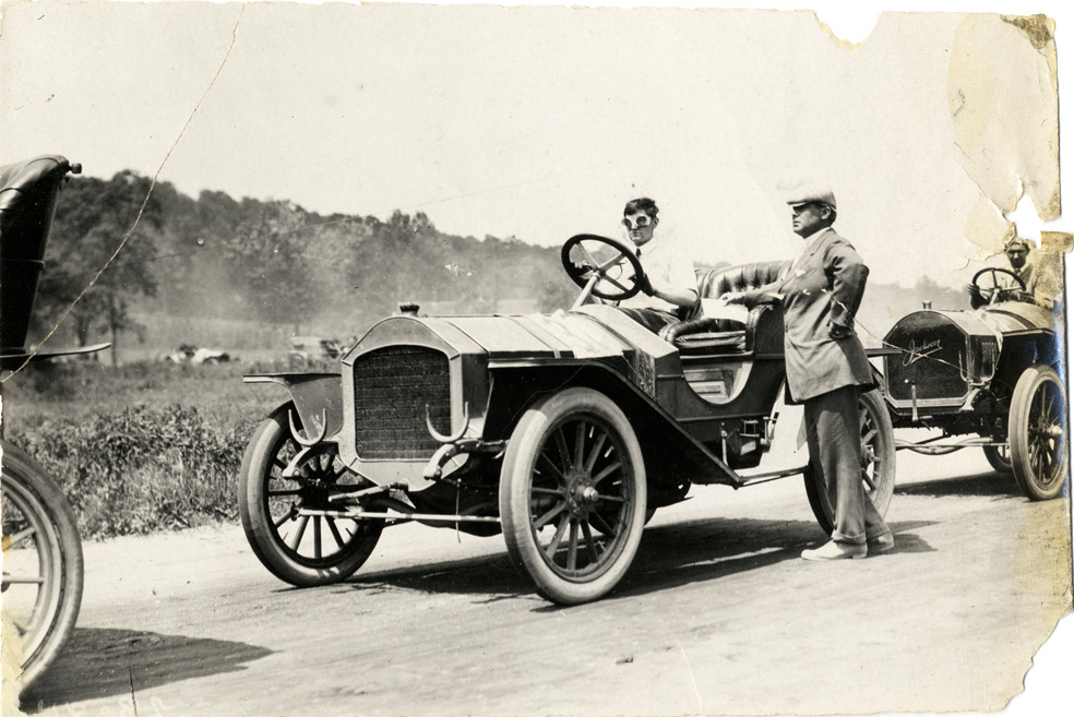 View of motorists posing with an Acme car on road. Jackson car is partially visible in background. Stamped on back: "Spooner and Wells, 1931 Broadway, New York, duplicates any time, enlargements all sizes, tel. 3472-3473 Col., credit appreciated." Handwritten on back: "Acme, '08."