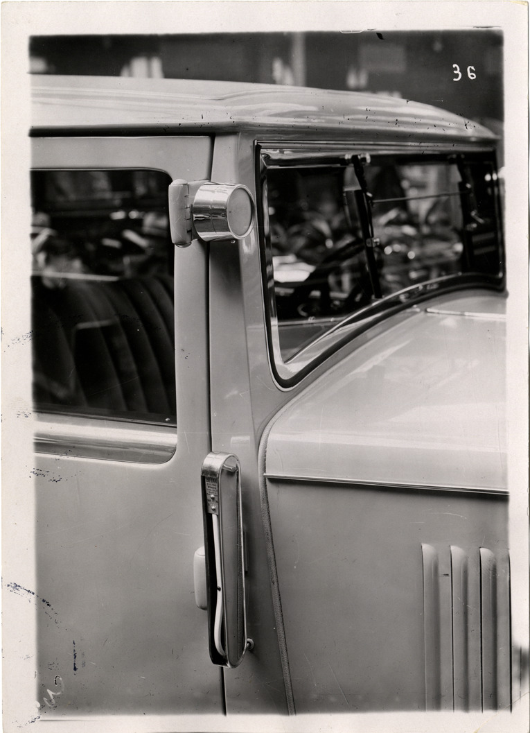 View of signaling device on a 1930 Adler automobile. Label on back: "Adlerwerke (Motors), Adler photographs, 1930." Stamped on back: "'Meurisse' 9, Faubourg Montmartre, Paris." Handwritten on back: "Signalisation et feu de postions dans la [undecipherable]. Adler, 1930."