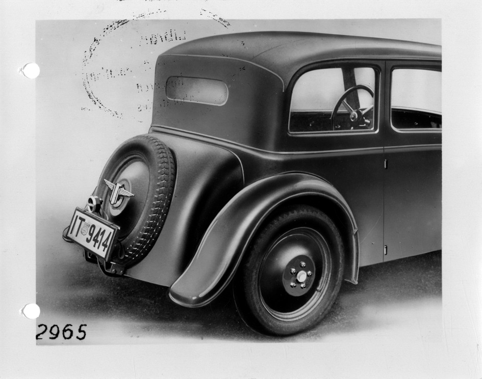 Artist's depiction of a 1934 Adler Trumpf Junior automobile. Label on back: "2965. Der neue Adler 'Trumpf Junior' besitzt am Heck einen grossen Kofferkasten, der gestattet reichlich Gepack zu verstauen." Handwritten on back: "Adler Trumpf Junior, 1934. Adler 1934."