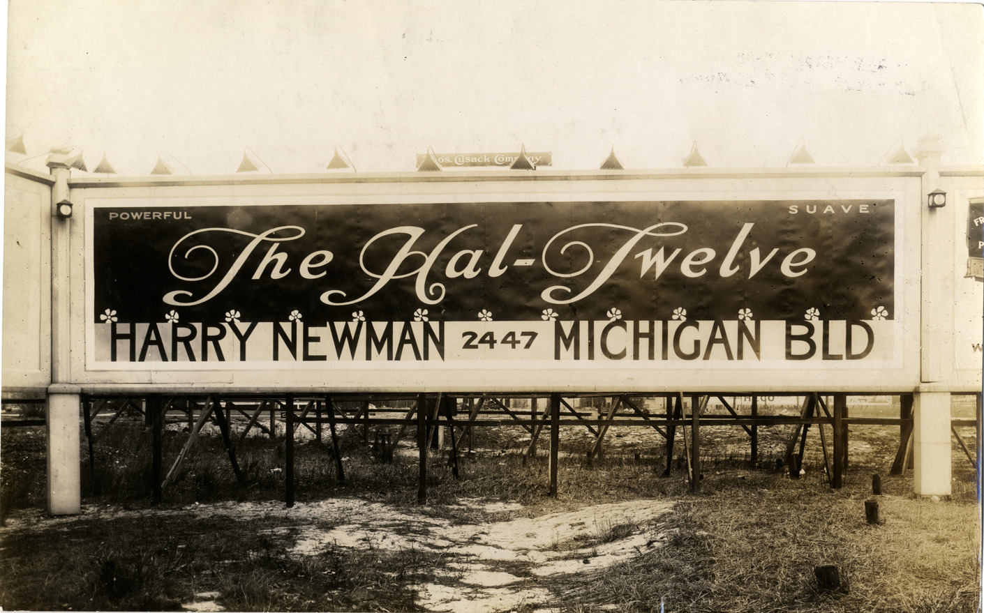 Favorite this☆ Advertising billboard Description: View of a Thos. Cusack Company billboard advertising the Hal-Twelve automobile sold by the Harry Newman dealership. Printed on billboard: "Powerful, suave. The Hal-Twelve. Harry Newman 2447 Michigan Bld." Details Resource ID: na041348 Subject: Billboards Advertising--Automobiles Hal Motor Car Company Photographic prints Date Issued: Unknown year Format: 1 photographic print ; 6 x 9.5 in. Member of: National Automotive History Collection Filing Location: Advertising-Outdoor Rights: Physical rights are retained by DPL. Copyright is retained in accordance with U.S. copyright laws.