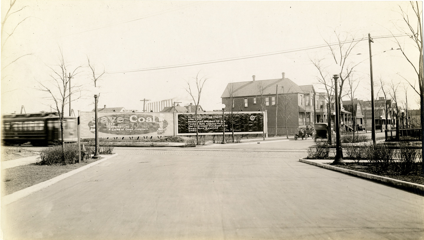 Distant view of two billboards at intersection of street. Houses in background. Printed on billboards: "Save coal, keep temperature a case of good judgment" and "No softer running engine ever built heated and cracked up gas rushed thru without waste the Chalmers 'Hot Spot' and 'Ram's Horn' manifold. $1485. Harry Newman."