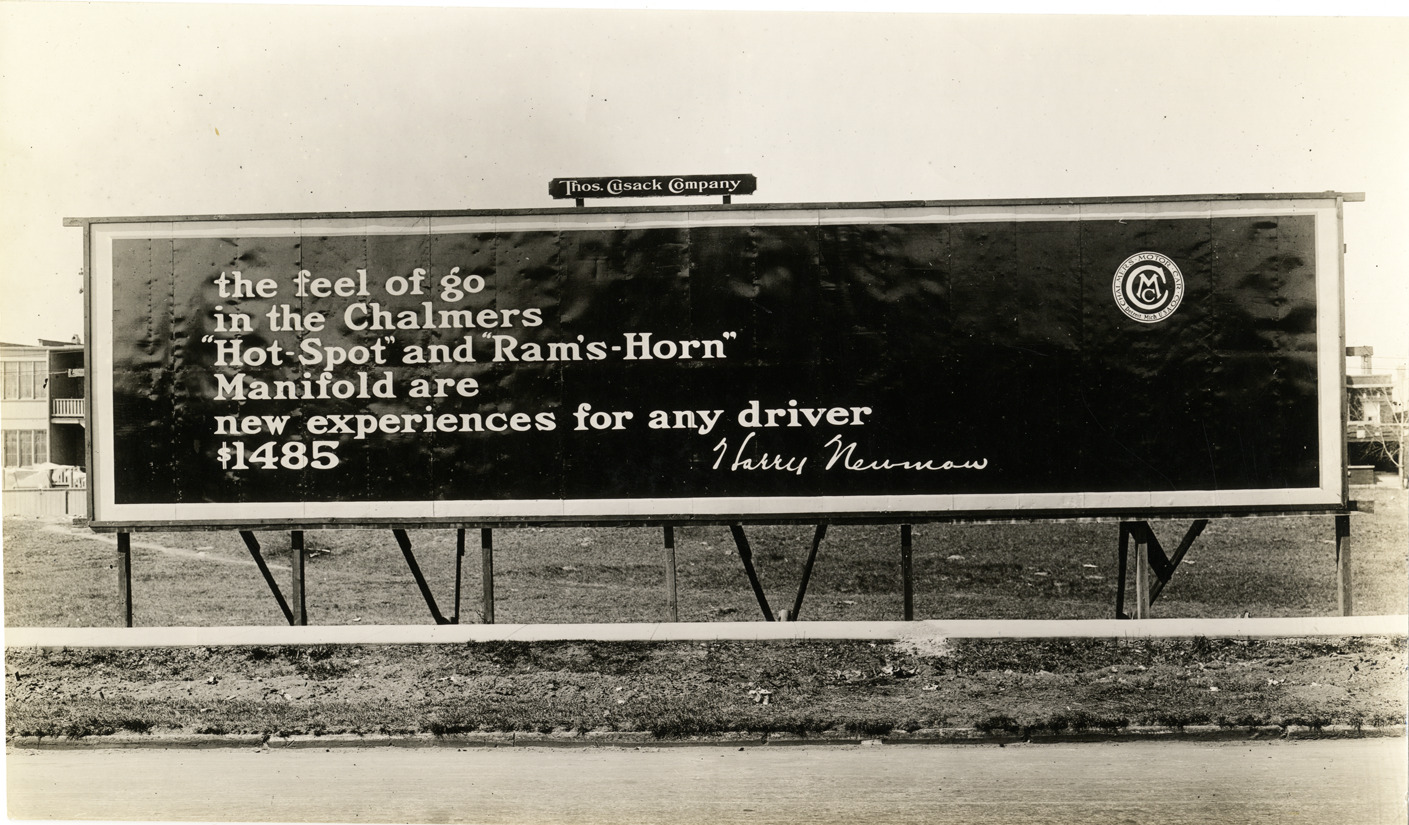 View of a Thos. Cusack Company billboard advertising Chalmers automobiles sold by the Harry Newman Company. Printed on billboard: "The feel of go in the Chalmers 'Hot-Spot' and 'Ram's-Horn' manifold are new experiences for any driver. $1485. Harry Newman."