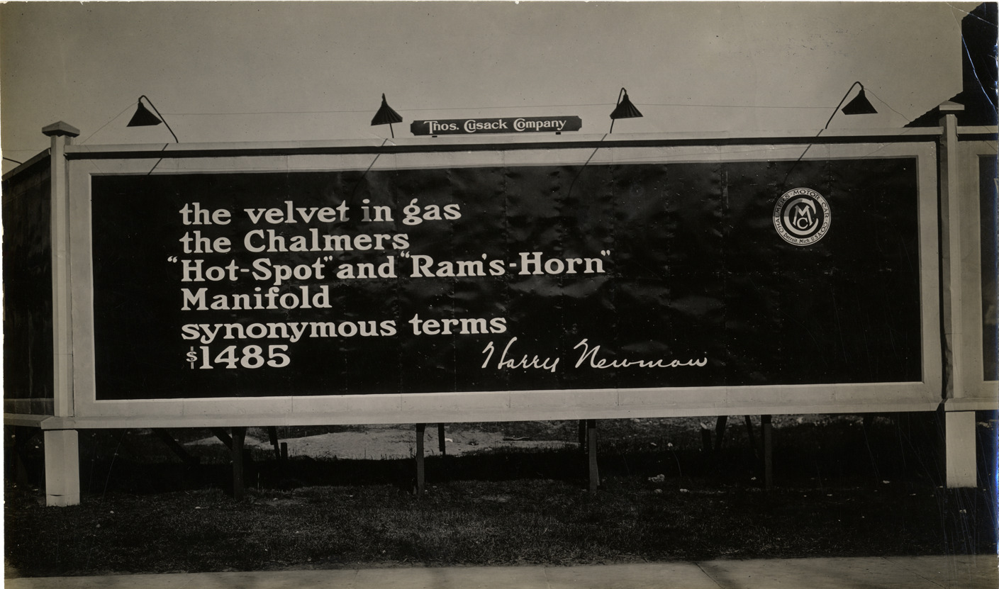 View of a Thos. Cusack Company billboard advertising Chalmers automobiles sold by the Harry Newman Company. Printed on billboard: "The velvet in gas the Chalmers 'Hot-Spot' and 'Ram's-Horn' manifold synonymous terms. $1485. Harry Newman."