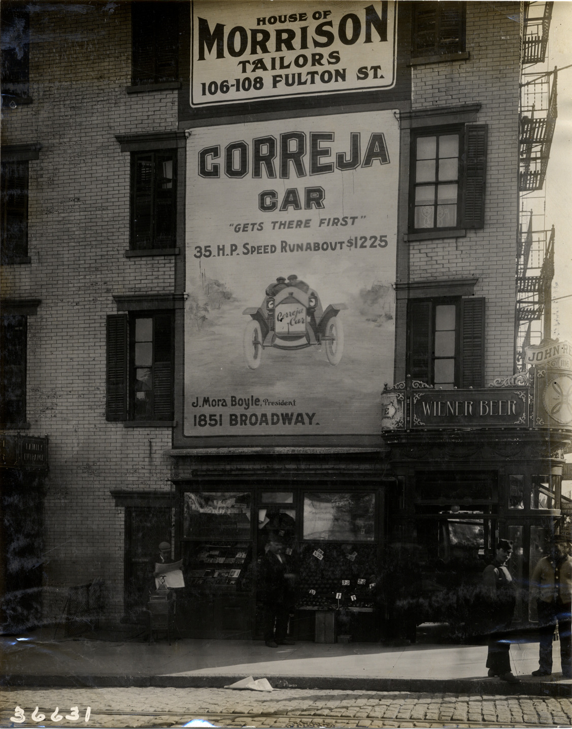 View of a billboard advertising Correja automobiles on a brick building with storefront. Printed on billboard: "Correja car gets there first. 35 h.p. speed runabout $1225. J. Mora Boyle, president. 1851 Broadway." Stamped on back: "Spooner & Wells, Inc., photographers, telephones 3472-3473 Columbus, 1931 Broadway, New York." Handwritten on back: "Advertising, ca. 1910."