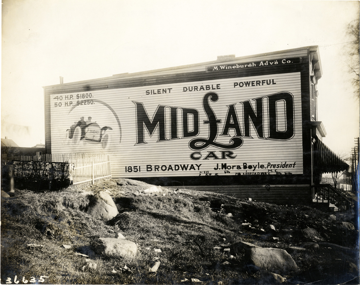 View of a M. Wineburgh Advertising Co. billboard advertising Midland cars on the side of a wooden-frame house. Printed on billboard: "Silent, durable, powerful Midland car. 1851 Broadway, J. Mora Boyle, president. 40 h.p. $1800, 50 h.p. $2250." Stamped on back: "Spooner & Wells, Inc., photographers, telephones 3472-3473 Columbus, 1931 Broadway, New York." Handwritten on back: "Advertising, 1910."