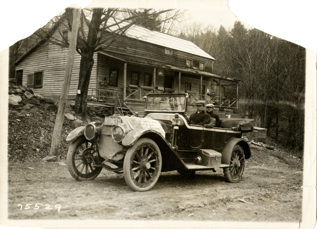 View of motorists in Alco pathfinding car passing a wooden-frame building during the West Hudson and Catskill Touring Contest. Label on back: "Complimentary photo sent out by the American Locomotive Company. Use will be appreciated. 75529. The Alco pathfinding car on the West Hudson and Catskill." Stamped on back: "Spooner & Wells, Inc., photographers, 1931 Broadway, N.Y. City, phones 3472-3473 Col."