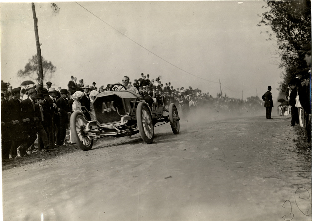 View of driver racing an Allen-Kingston car past spectators on roadside. Stamped on back: "Spooner & Wells, Inc., photographers, telephones 3472-3473 Columbus, 1931 Broadway, New York." Handwritten on back: "Allen-Kingston, ca.1909."