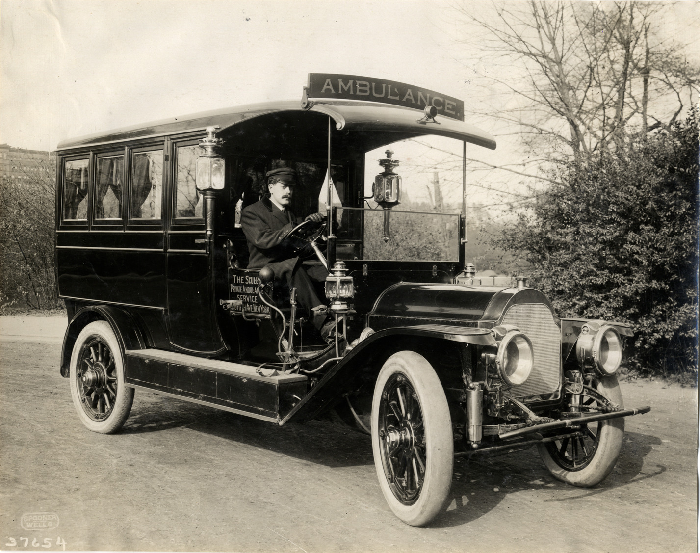 View of driver posing in an ambulance for the Scully Private Ambulance Service in New York. Stamped on back: "Spooner & Wells, Inc., photographers, telephones 3472-3473 Columbus, 1931 Broadway, New York." Handwritten on back: "Ambulance, 1911."