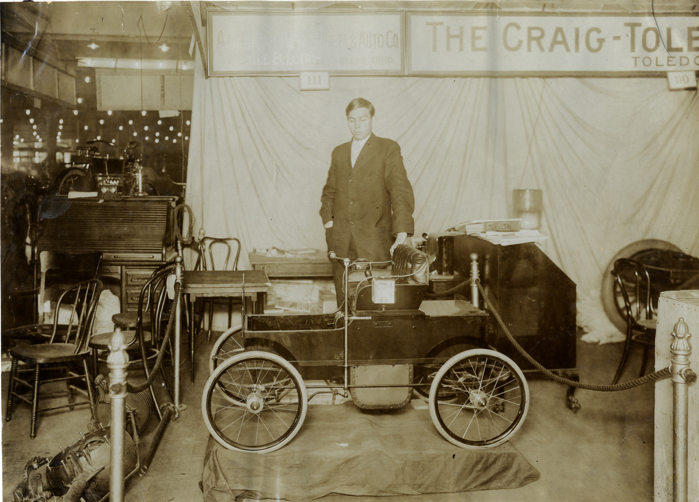 View of a man posing with an American Juvenile electric car at a trade show. Roll-top desk and chairs in background. Signs are displayed in exhibit area. Handwritten on back: "American Juvenile, 1907."