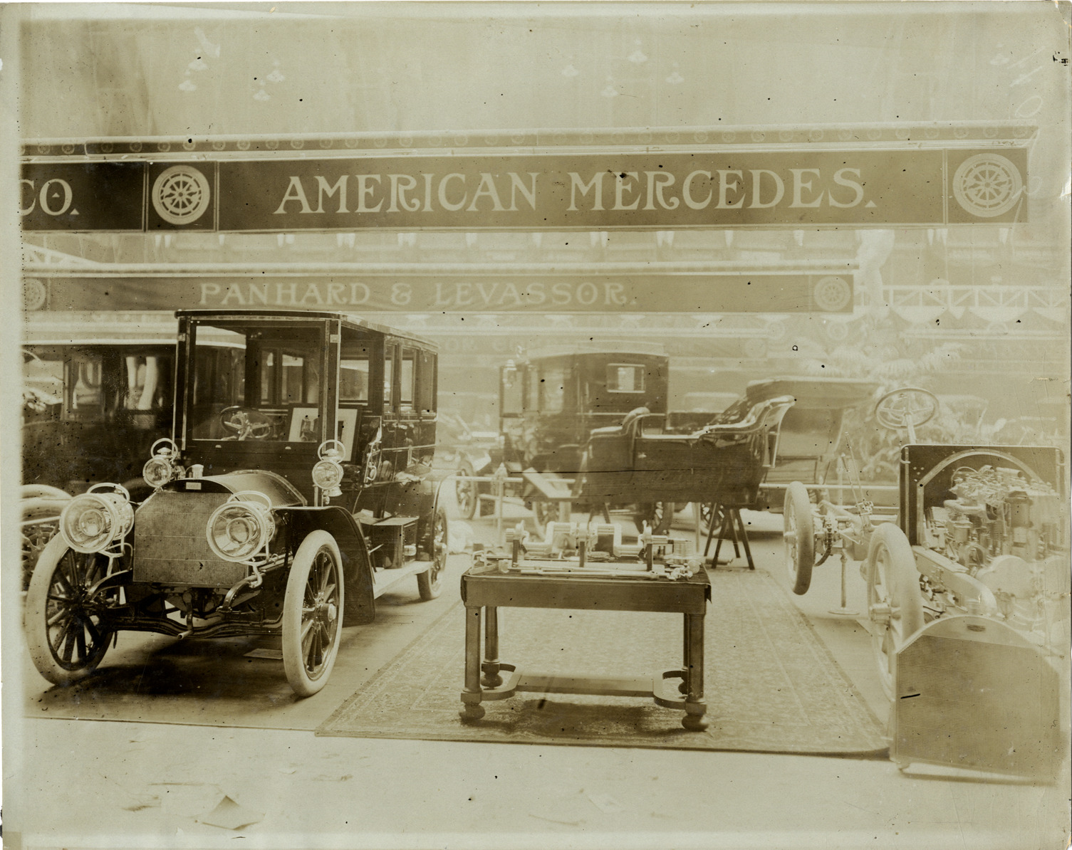 View of American Mercedes cars and chassis on display at trade show. "American Mercedes" sign is displayed overhead; "Panhard & Levassor" sign in background. Stamped on back: "Photo by F. Ed. Spooner, 1536 B'way, telephone 6536-38th St., New York, N.Y." Handwritten on back: "American Mercedes, ca. 1906."
