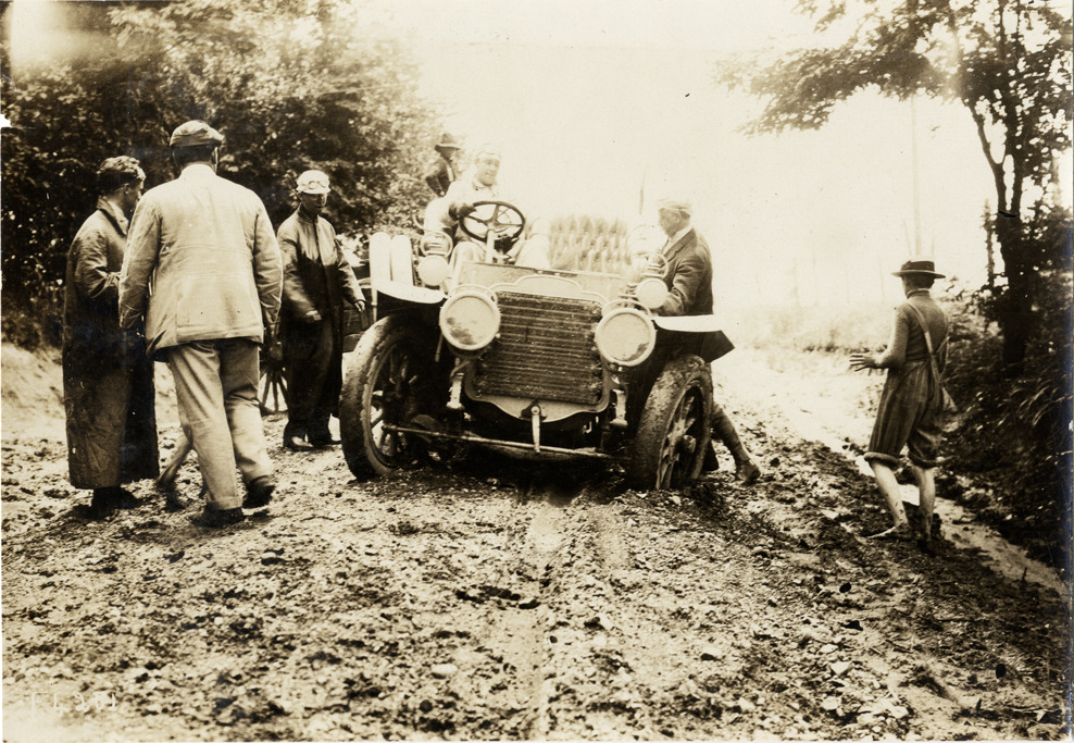 Favorite this☆ Motorists with American Mors automobile on muddy road, 1907 Glidden Tour Description: View of motorists with an American Mors car on a muddy rural road during the 1907 Glidden Tour. Handwritten on back: "American Mors, ca. '07, Glidden." Details Resource ID: na041488 Subject: Automobiles St. Louis Car Company Dirt roads Glidden Tour (1907) Automobile driving--Competitions--United States Photographic prints Date Issued: 1907-07 Format: 1 photographic print ; 4.5 x 6.5 in. Member of: National Automotive History Collection Lazarnick Collection Filing Location: General photograph files, American Mors Rights: Physical rights are retained by DPL. Copyright is retained in accordance with U.S. copyright laws.