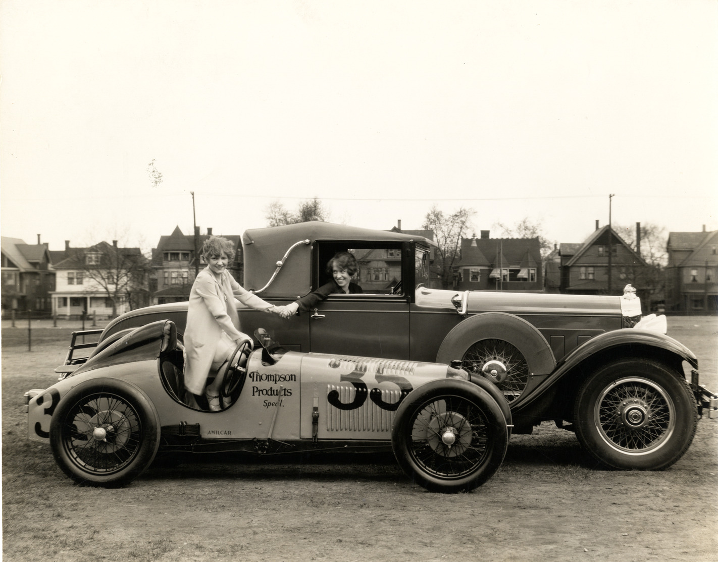 View of an Amilcar racecar and automobile. Two women shake hands while posing in automobiles. "Amilcar, Thompson Products speed, 35" is painted on side of racecar. Typed on back: "Owned by Thompson Products Inc." Handwritten on back: "Amilcar racing car."
