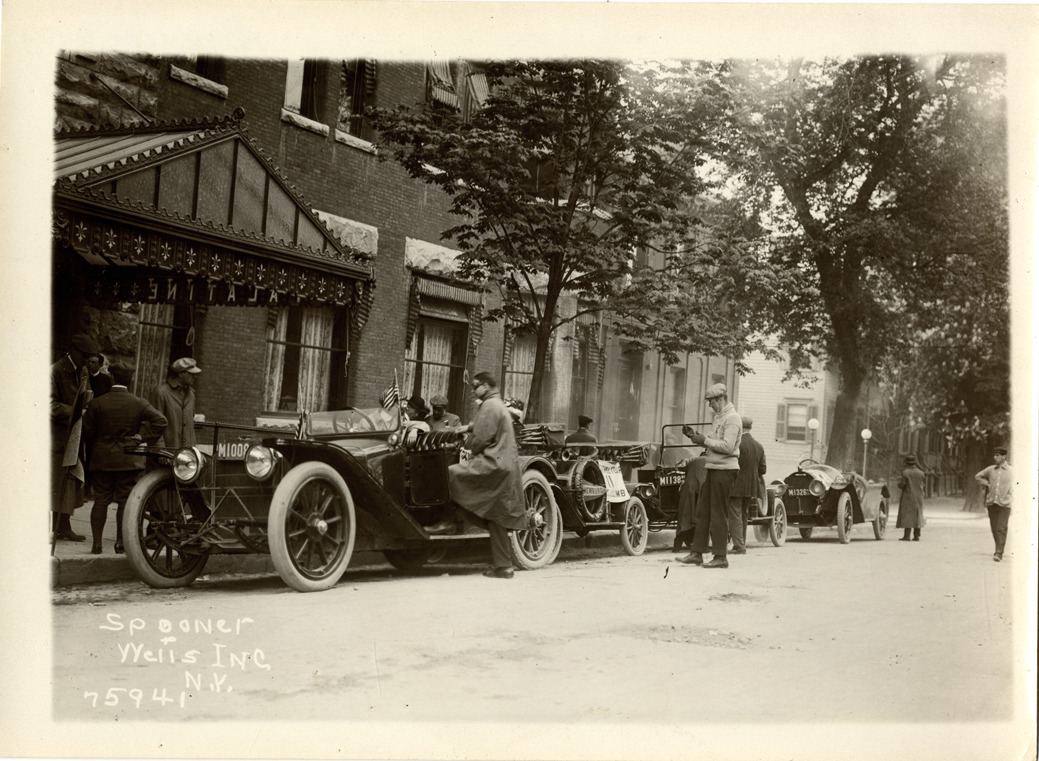 View of motorists with American Underslung cars parked in street. Printed on front: "Spooner & Wells Inc., N.Y." Stamped on back: "Spooner & Wells, Inc., photographers, 1931 Broadway, N.Y. City, phones 3472-3473 Col." Handwritten on back: "American, ca. 1913."