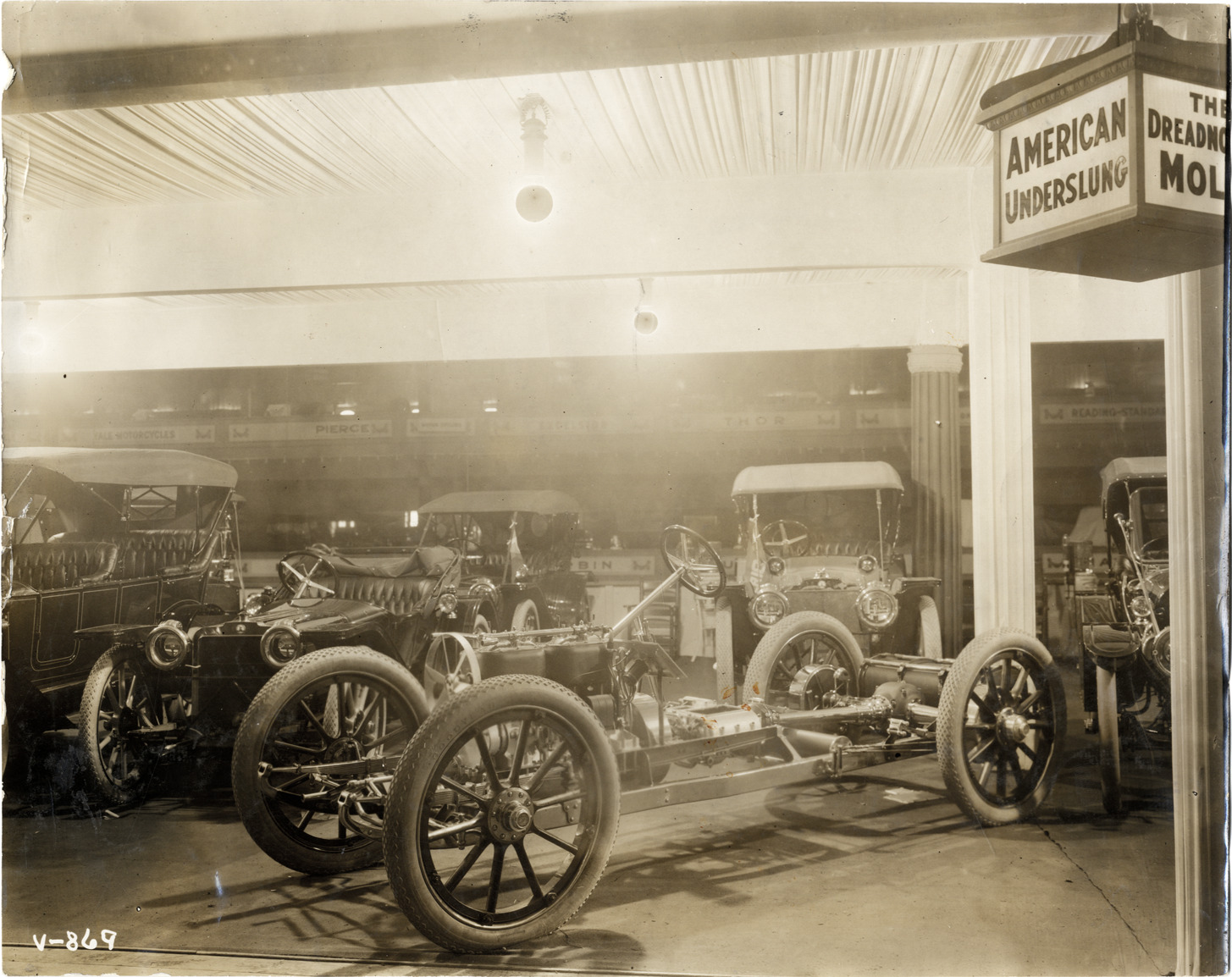 1912 American Underslung automobiles and chassis on display at trade show