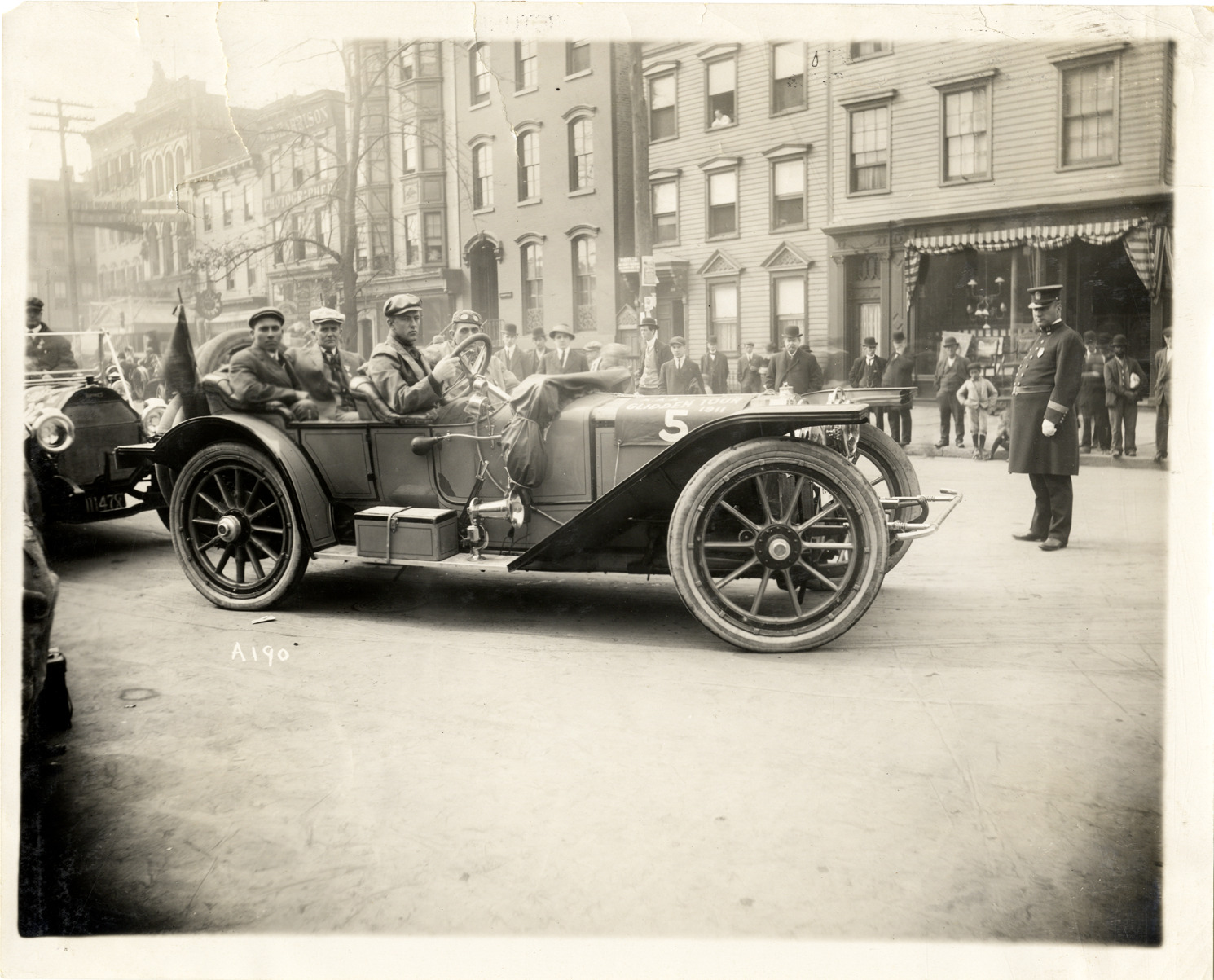 View of motorists posing in American car no. 5 during the 1911 Glidden Tour. Spectators, policeman and commercial buildings in background. Stamped on back: "Spooner & Wells, Inc., photographers, telephones 3472-3473 Columbus, 1931 Broadway, New York." Handwritten on back: "American, ca. 1911."