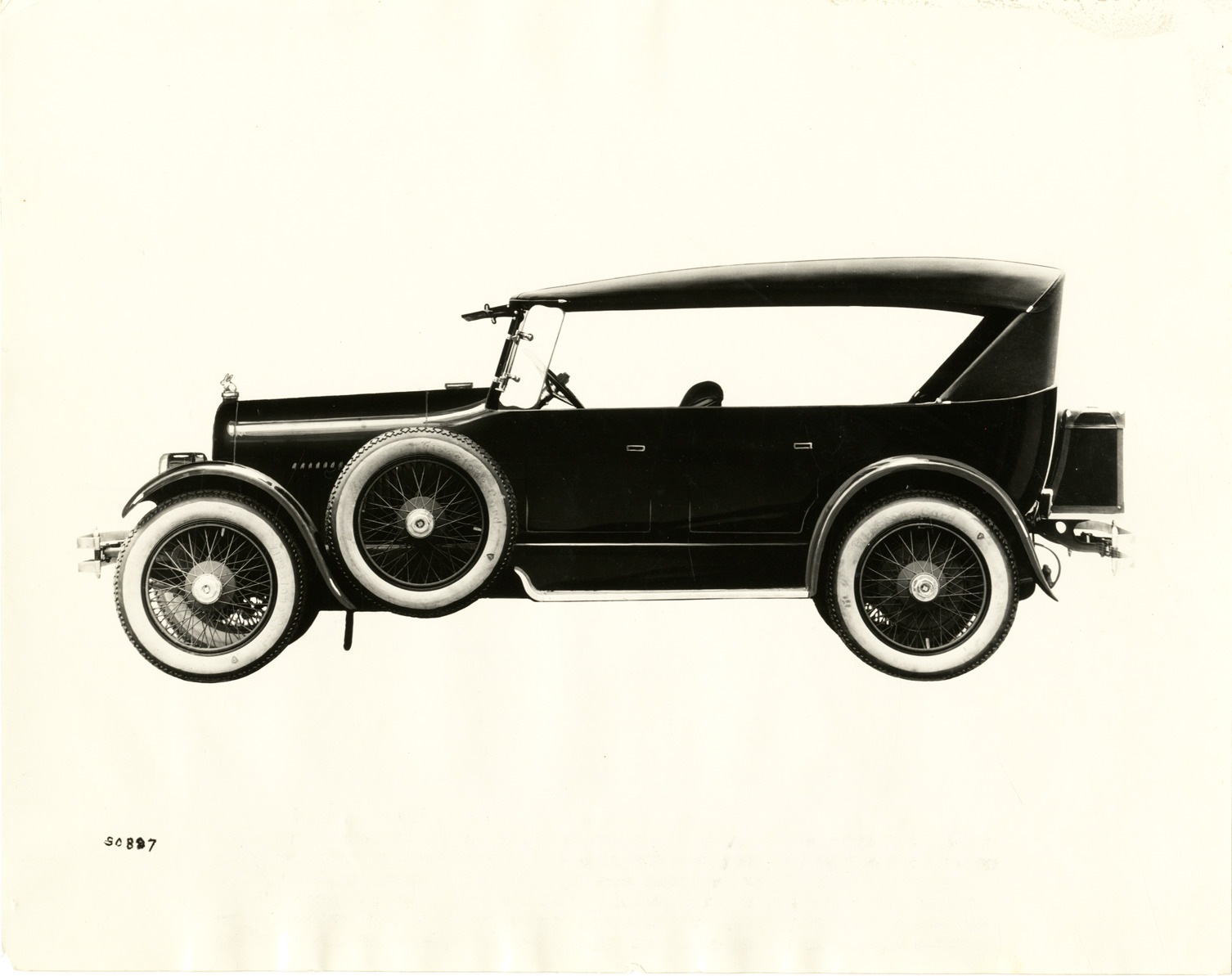 View of a 1923 Apperson car. Label on back: "The new Apperson seven passenger phaeton is a combination of beauty, elegance and strength. Its many refinements place it among the finer cars of to-day. The wheelbase is 130 inches and it is powered with an eight cylinder motor. Bumpers of the double spring type in both front and rear, two extra tires, trunk equipped with suitcases, side shields, sun visor, gasoline gauge on dash and a new radiometer which registers the temperature of the motor are listed as regular equipment." Handwritten on back: "Apperson, 1923."