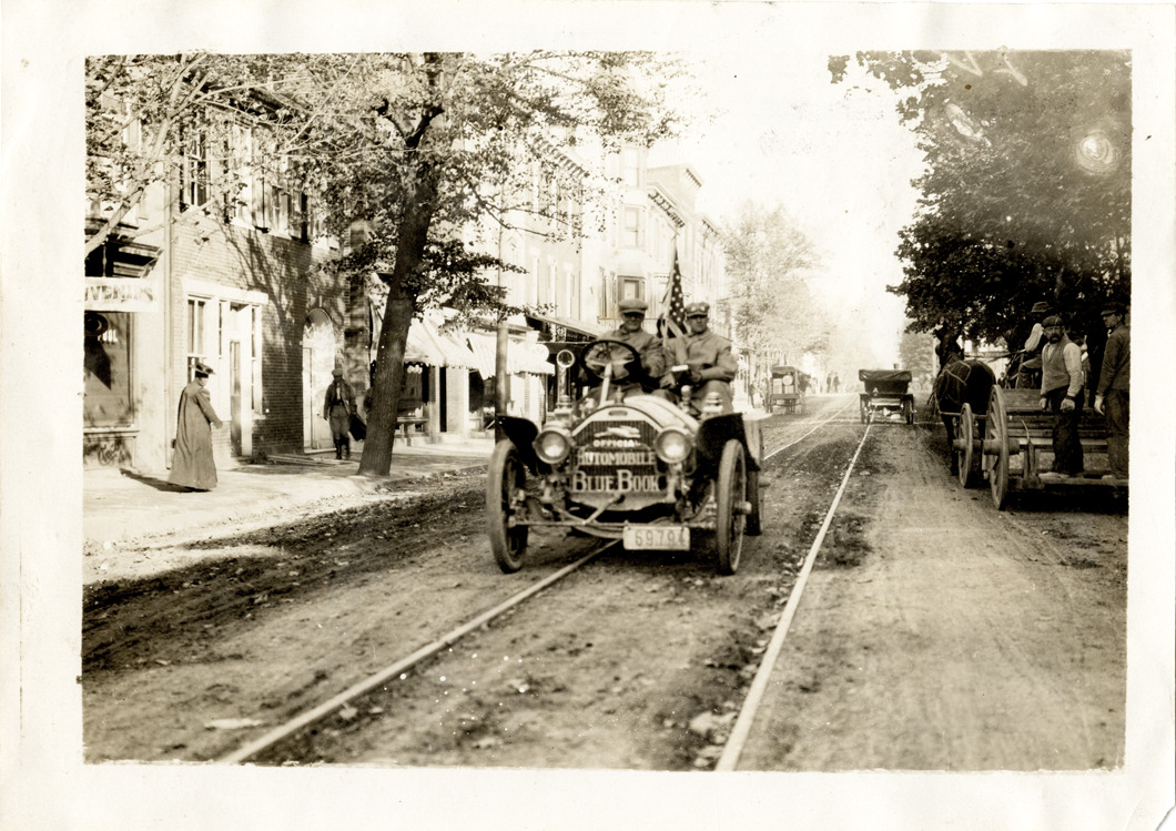 View of motorists in Apperson "Jack Rabbit" car, during the 1909 New York to Atlanta Good Roads Tour. "Official Automobile Blue Book" sign is displayed on front of car. Stamped on back: "Photo by Spooner & Wells, Inc. 1931 Broadway, N.Y." Handwritten on back: "Apperson, 1909."