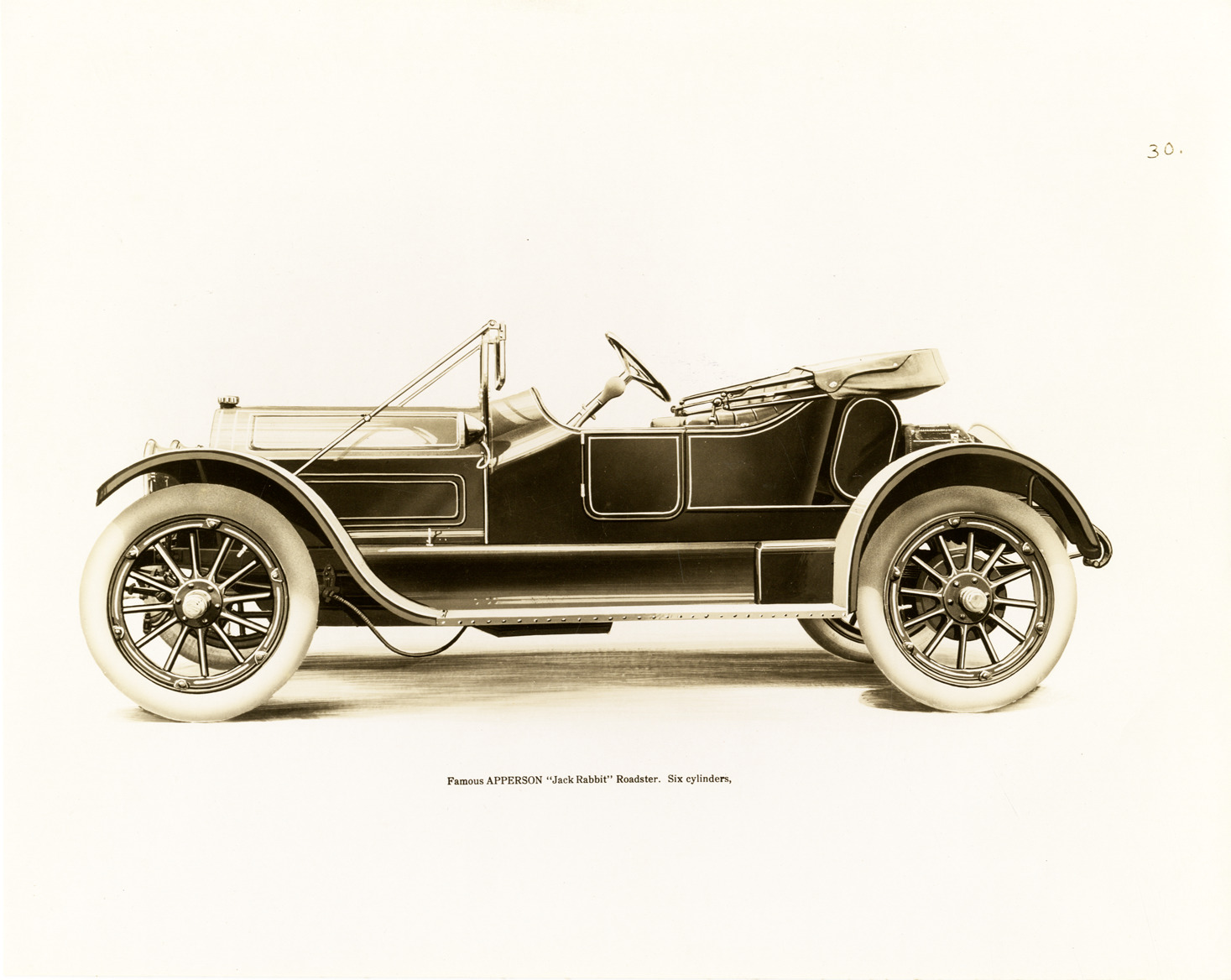 Artist's depiction of an Apperson "Jack Rabbit" car. Printed on front: "Famous Apperson 'Jack Rabbit' roadster, six cylinders." Stamped on back; "Stadler Photographing Company Incorporated. New York, Chicago." Handwritten on back: "Apperson, c.1913."