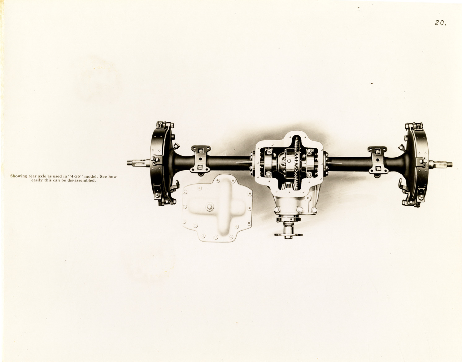 Artist's depiction of a rear axle for an Apperson car. Printed on front: "Showing rear axle as used in '4-55' model. See how easily this can be dis-assembled." Stamped on back; "Stadler Photographing Company Incorporated. New York, Chicago." Handwritten on back: "Apperson, c.1913."