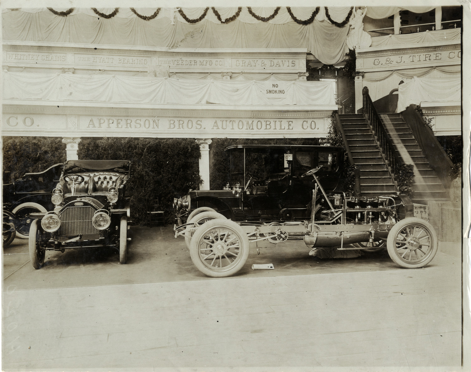 Favorite this☆ Apperson automobiles on display at trade show Description: View of Apperson cars and chassis on display at trade show. "Apperson Bros. Automobile Co." sign displayed in background. Handwritten on back: "Apperson, c.1906." Details Resource ID: na041645 Subject: Automobiles Automobiles--Chassis Apperson Brothers Automobile Company Trade shows Photographic prints Date Issued: Unknown year Format: 1 photographic print ; 8 x 10 in. Member of: National Automotive History Collection Lazarnick Collection Filing Location: General photograph files, Apperson Rights: Physical rights are retained by DPL. Copyright is retained in accordance with U.S. copyright laws.