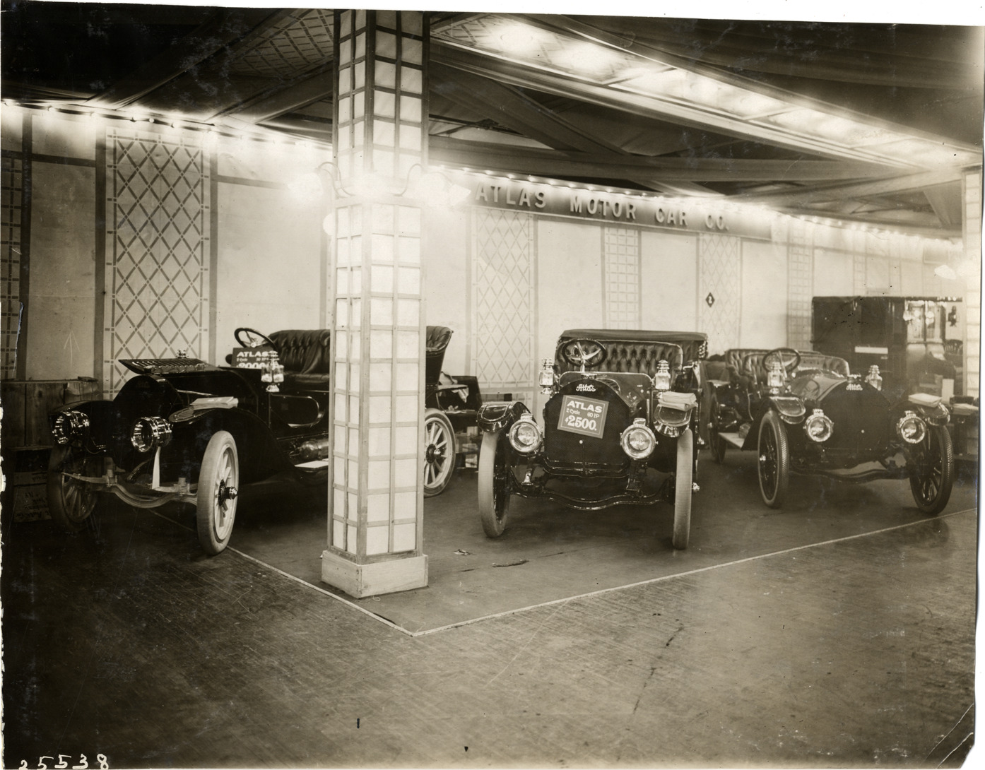 View of 1910 Atlas cars on display at trade show. "Atlas Motor Car Co." sign is displayed in background. Stamped on back: "Spooner & Wells, Inc., photographers, telephones 3472-3473 Columbus, 1931 Broadway, New York." Handwritten on back: "Atlas, 1910."