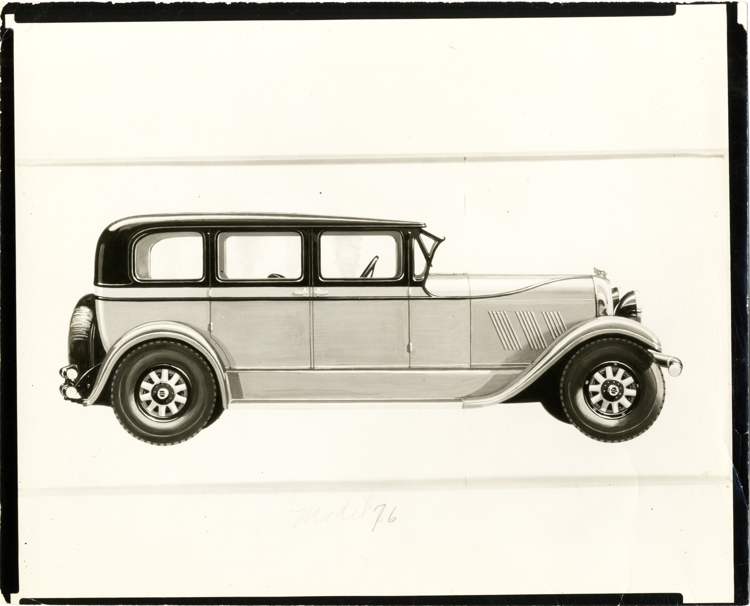 Artist's depiction of a 1928 Auburn Model 76 sedan. Typed on back: "Auburn Model 76 sedan. 120" wheelbase. 6 cyl. motor. Internal expanding Lockheed hydraulic four wheel brakes. Bijur chassis lubrication." Handwritten on back: "Auburn Six, 1928."