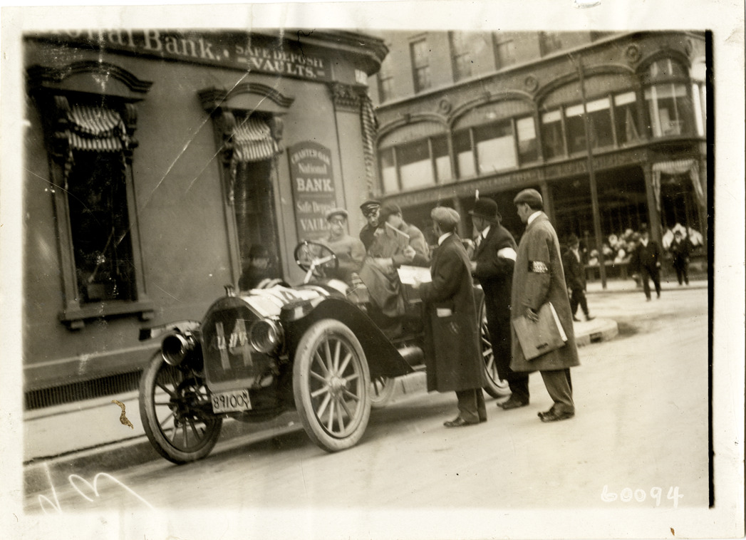 View of officials speaking with motorists in 1910 Auburn car no. 14. Bank in background. Stamped on back: "Spooner & Wells, Inc., photographers, telephones 3472-3473 Columbus, 1931 Broadway, New York." Handwritten on back: "Model R touring, 4 cyl. Auburn, 1910."