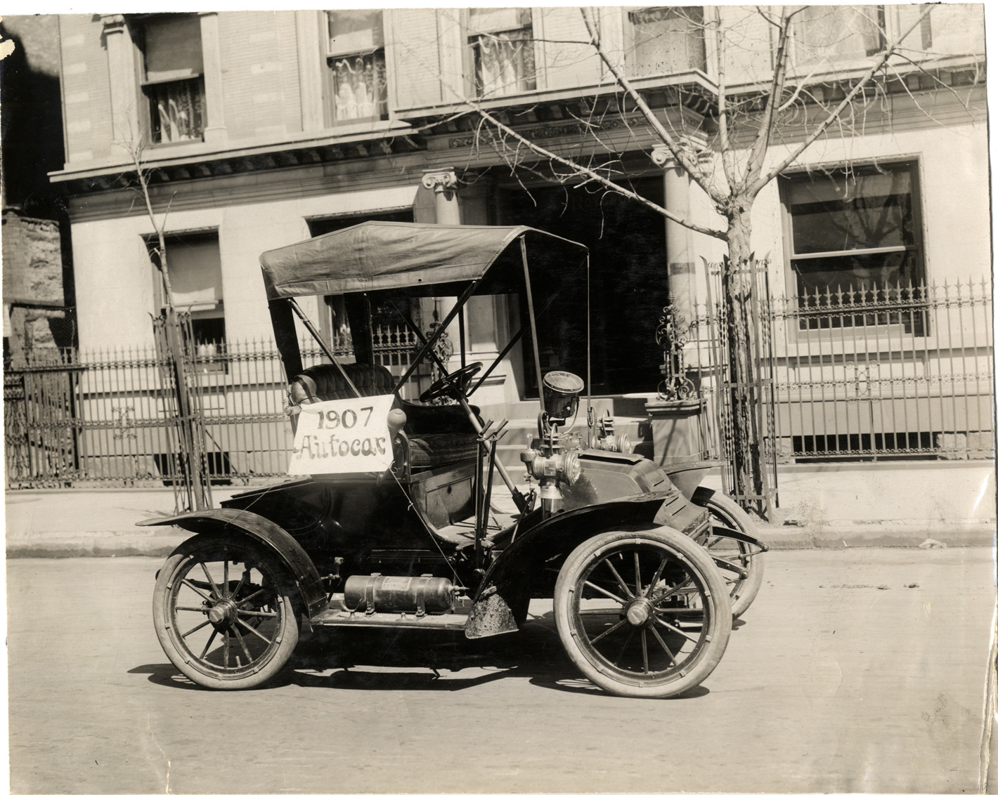 View of a 1907 Autocar. "1907 Autocar" sign is displayed on car. Handwritten on back: "Autocar, 1907."