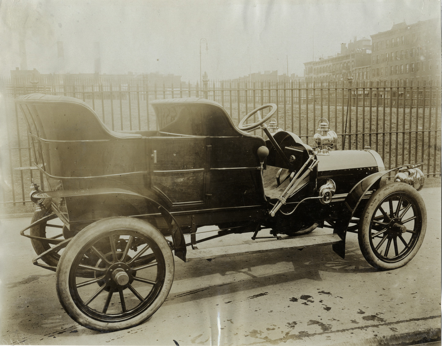 View of a 1906 Ariel car. Factory in background. Stamped on back: "Photo by F. Ed. Spooner, 1536 B'way, telephone 6536-38th St., New York, N.Y." Handwritten on back: "Ariel, 1906."