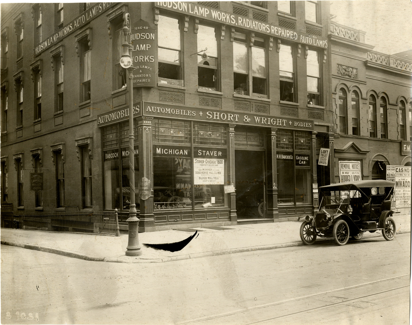 View of a Babcock car parked in front of the Short & Wright automobile dealership. Lamppost on corner; Hudson Lamp Works on second floor of building. Stamped on back: "Spooner & Wells, Inc., photographers, telephones 3472-3473 Columbus, 1931 Broadway, New York." Handwritten on back: "Babcock, ca. 1910."