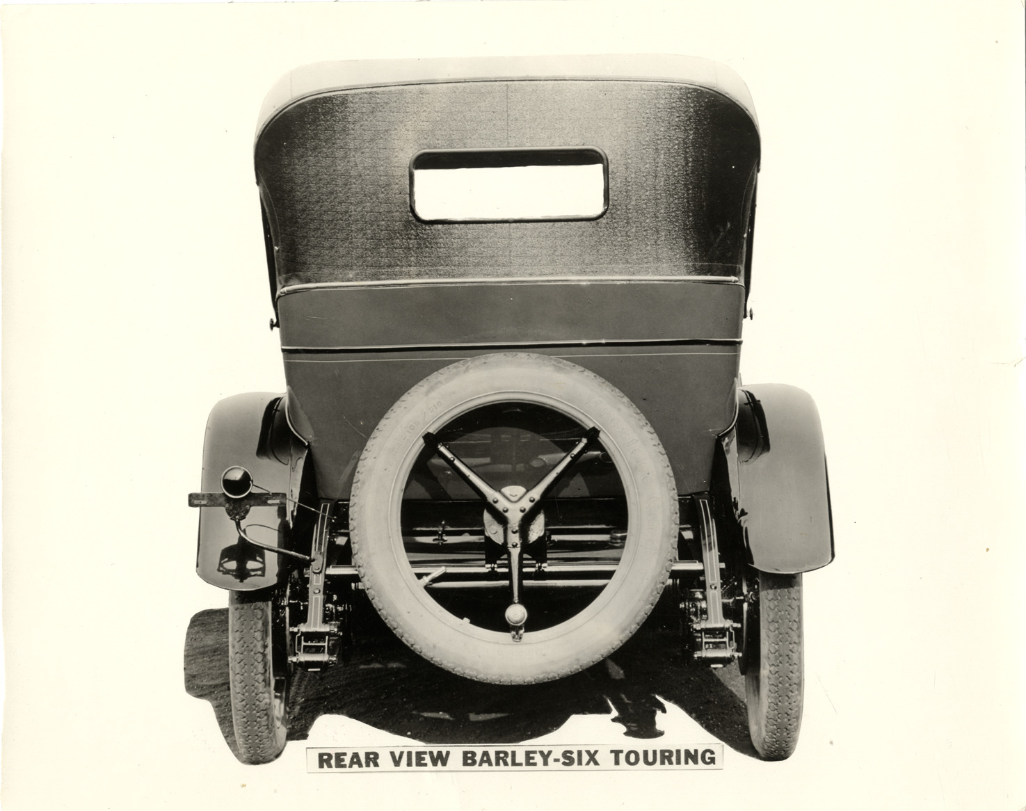 Rear view of a Barley Six touring car. Printed on front: "Rear view, Barley-Six touring." Handwritten on back: "Barley, ca. 1923-24."