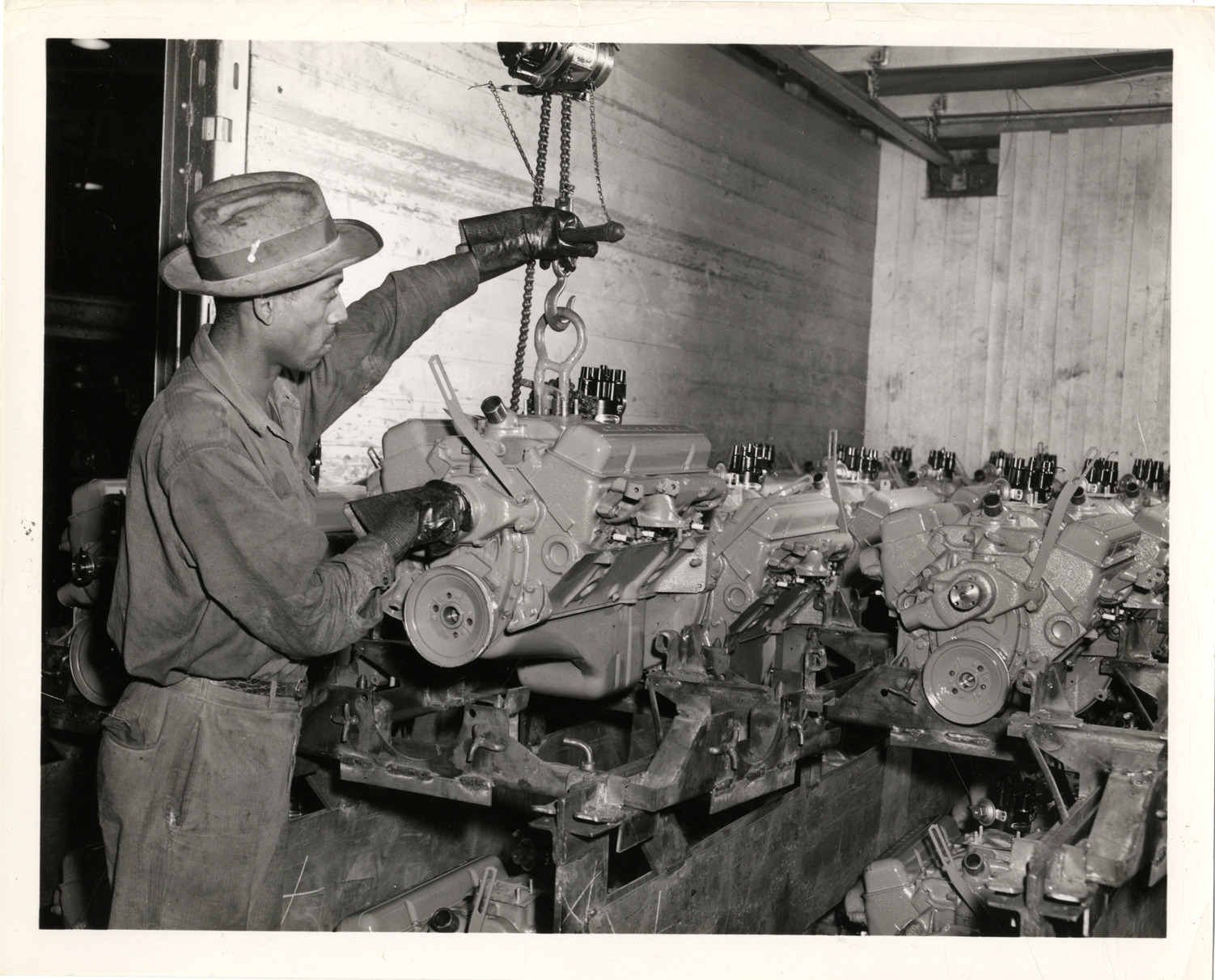 View of a man attaching a car engine to a hoist on conveyor. Label on back: "Meanwhile, engines are being routed by conveyor to the assembly line." Stamped on back: "GM Photographic, 465 W. Milwaukee, Detroit, Mich. Please refer to this number when ordering prints."