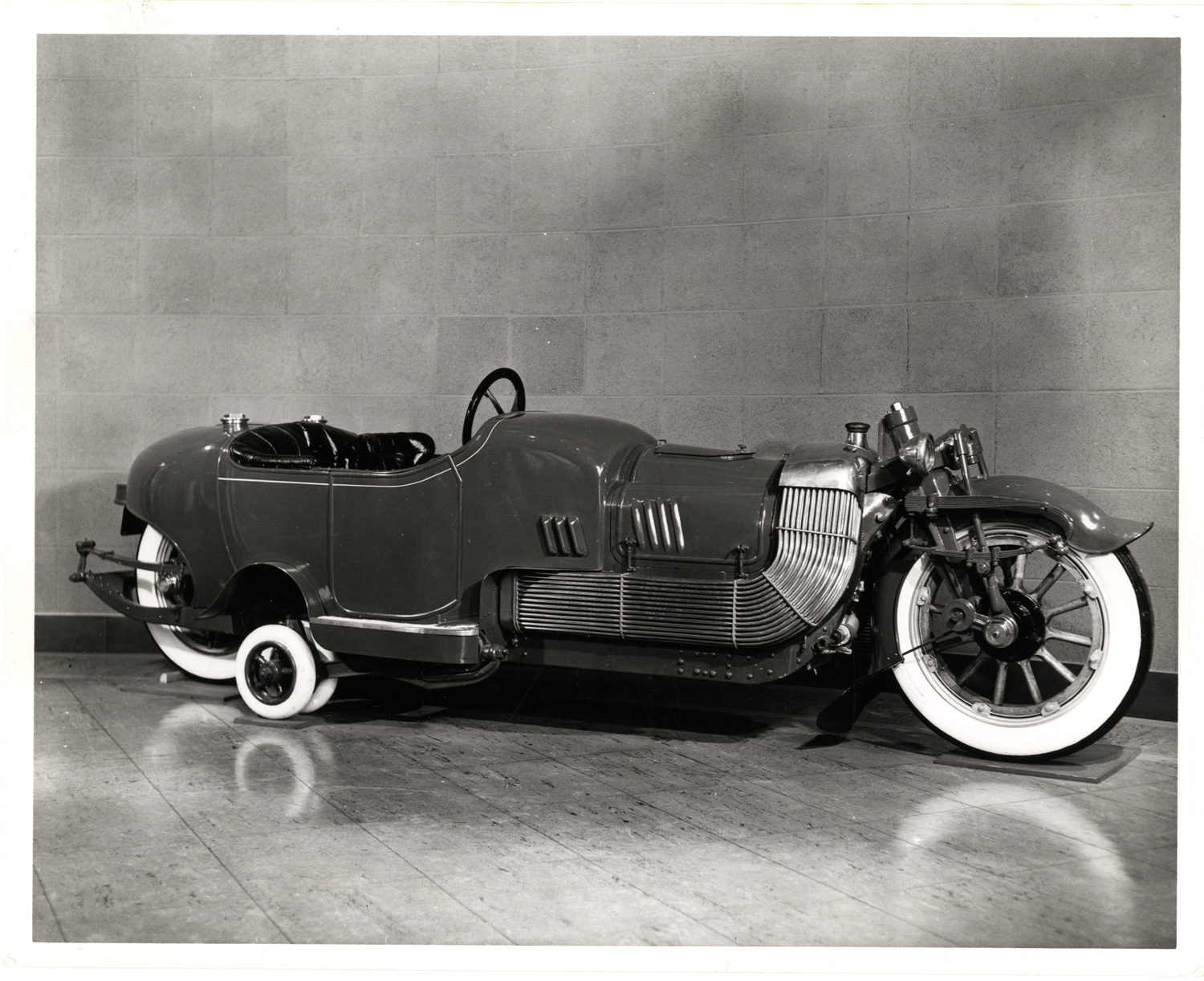 View of a Bi-Autogo, an experimental car designed by James Scripps Booth. Handwritten on back: "Scripps Bi-Autogo car built in 1908-1912 and now owned by the Detroit Historical Museum. This was the first Detroit car to be powered by a V-8 engine. (Only one model ever made). The small landing wheels on either side retract when car is in motion."