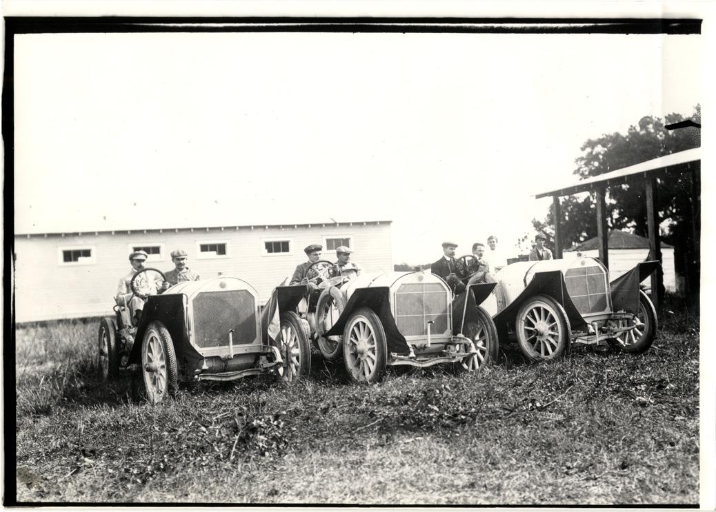 View of drivers and passengers posing in three Benz racecars during the 1908 Grand Prize races in Savannah, Georgia. Handwritten on back: "Fritz Erle, Victor Hemery, Rene Hanriot, Benz team, Am. Grand Prize, 1908." Handwritten on back: "Benz racer, 08."