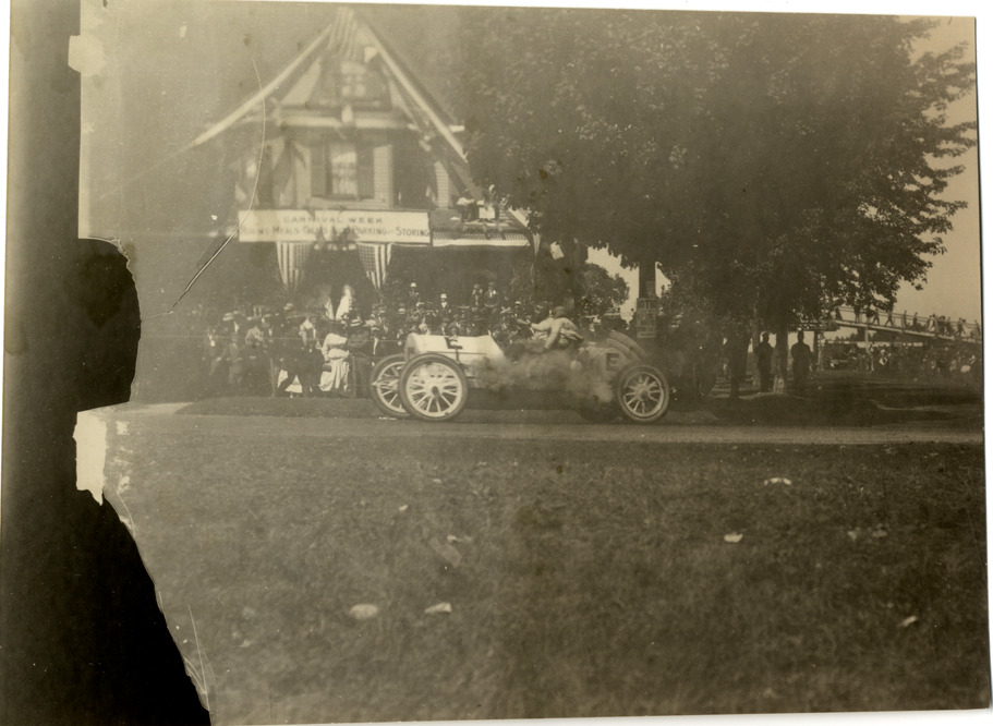 View of Stoecker driving Benz car no. E during the 1909 Crown Point races in Lowell, Indiana. House and spectators in background. Handwritten on back: "Stoecker, Benz. Lowell, 1909. Benz racer, '09."