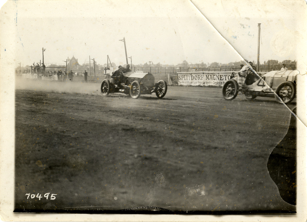 View of Bob Burman racing Benz car no. 4 and Louis Disbrow racing Mercedes car on course during 1911 Brighton Beach races. Stamped on back: "Spooner & Wells, Inc., photographers, telephones 3472-3473 Columbus, 1931 Broadway, New York." Handwritten on back: "4. Burman, Benz. Disbrow, Mercedes. Brighton Beach, 1911."