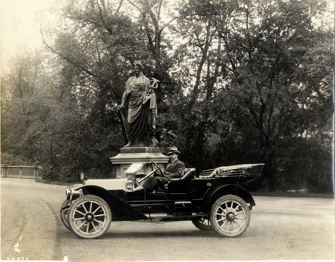 View of a man posing in a Bergdoll car. Statue of a figure holding a caduceus in background. Stamped on back: "Spooner & Wells, Inc., photographers, telephones 3472-3473 Columbus, 1931 Broadway, New York." Handwritten on back: "Bergdoll, ca. 1912."